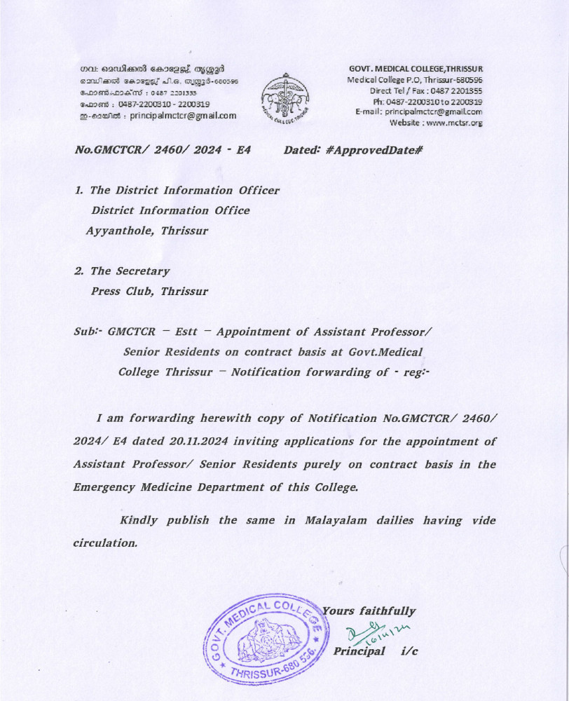 Applications are invited for Assistant Professor/Senior Resident on contract basis